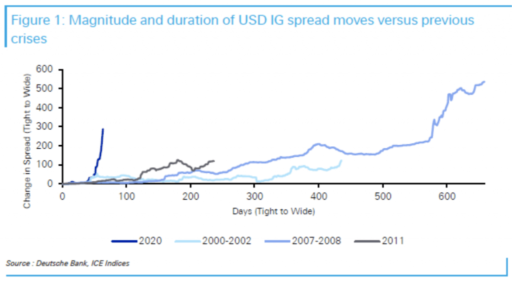 - » Most equity market investors are well paid to wait for any recovery, as well. For example, the dividend yield on the FTSE 100 index is now in excess of 6% per annum. Fixed income investors are also well paid, with high-grade corporate bond indices offering yields in excess of 4%, compared to bank deposit rates of zero or less in most countries. The chart below shows how extreme the market reaction has been compared to other bear markets, demonstrated by the speed and magnitude of the increase in spreads on USD investment grade bonds (the excess yield over government bonds)